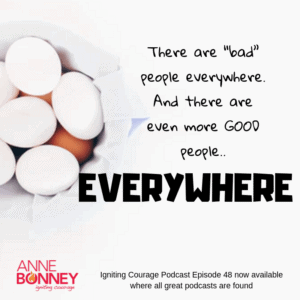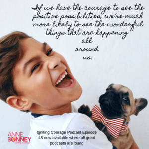 IGNITING COURAGE Podcast Episode 48: The Courage to Look for the Positive October 6, 2019 Let’s look for the good, because we see what we look for, and there are some amazing things to see! CLICK HERE TO LISTEN TO Episode 48: Look for the Good You can also find it on iTunes, Google Podcast, Spotify or Stitcher. Just search for “Igniting Courage with Anne Bonney” and look for the flaming O.